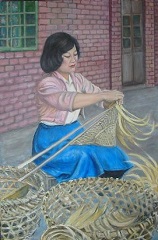 I grew up in rural Taiwan. Bamboo has been an important part of people’s lives. From building material, kitchen utensil, art material, to hat, the one this woman is making. The baskets are made of bamboo, too. The house I grew up had hundreds of bamboo trees in the backyard and bamboo shoots are served on our dinner table regularly. Oh, they are so good when they are cooked right after picked. I miss it very much! 25"W X 37.25"H