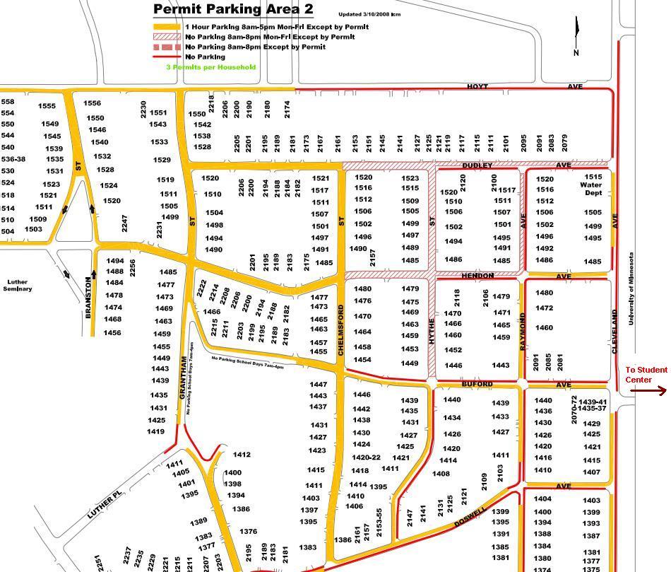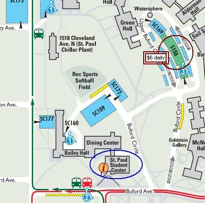 Metered parking is available on Buford Avenue, directly across from the St. Paul Student Center on the south side of the street, Eckles Avenue on the east side of the street and Carter Avenue on the south side of the street. Refer to the Web site at www.umn.edu/pts/.