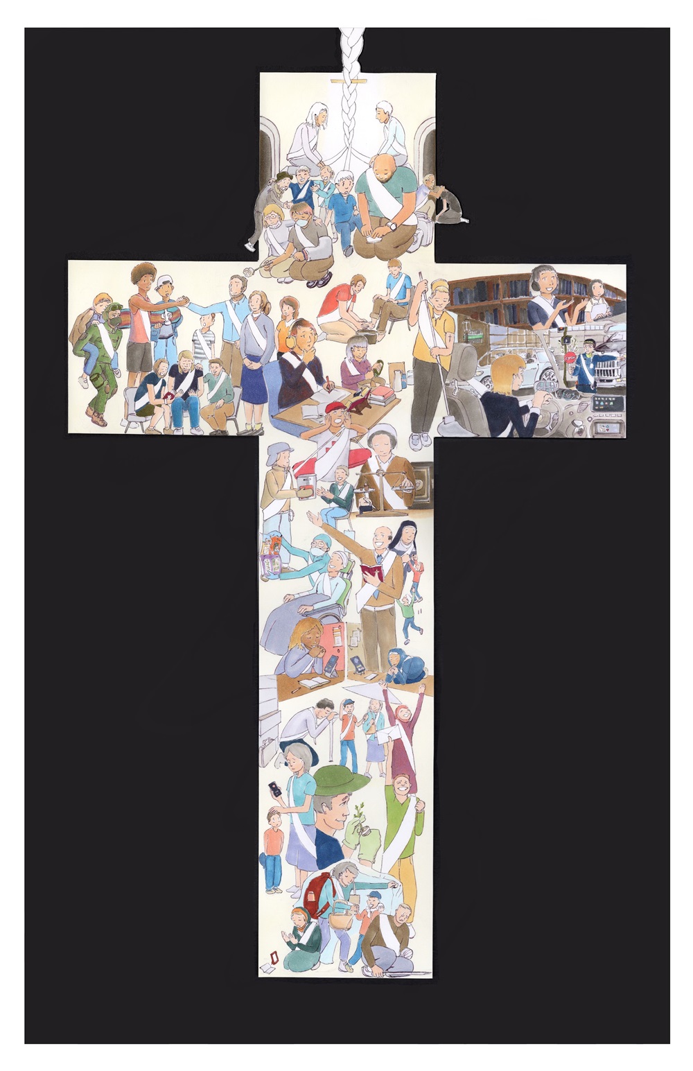 The braided rope that hangs above the cross is meant to represent the relationship we can now have towards God the Father through the cross. Through Jesus’ sacrificial death and victory over death on the cross, we have access to God. And by grace, we can have life (signified by the white/light border) beyond the darkness that surrounds all who live in this fallen world.