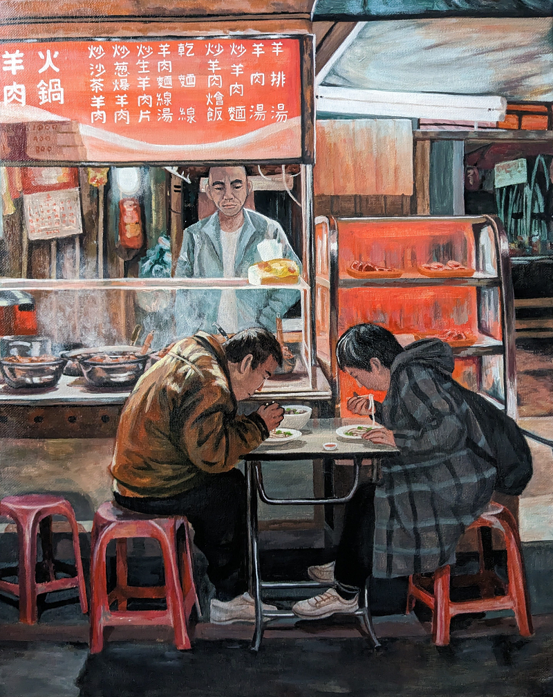 Red plastic chairs give their support to every weak body. Noodles filled with mutton soup are greedily consumed, and fill the stomachs of the hungry.