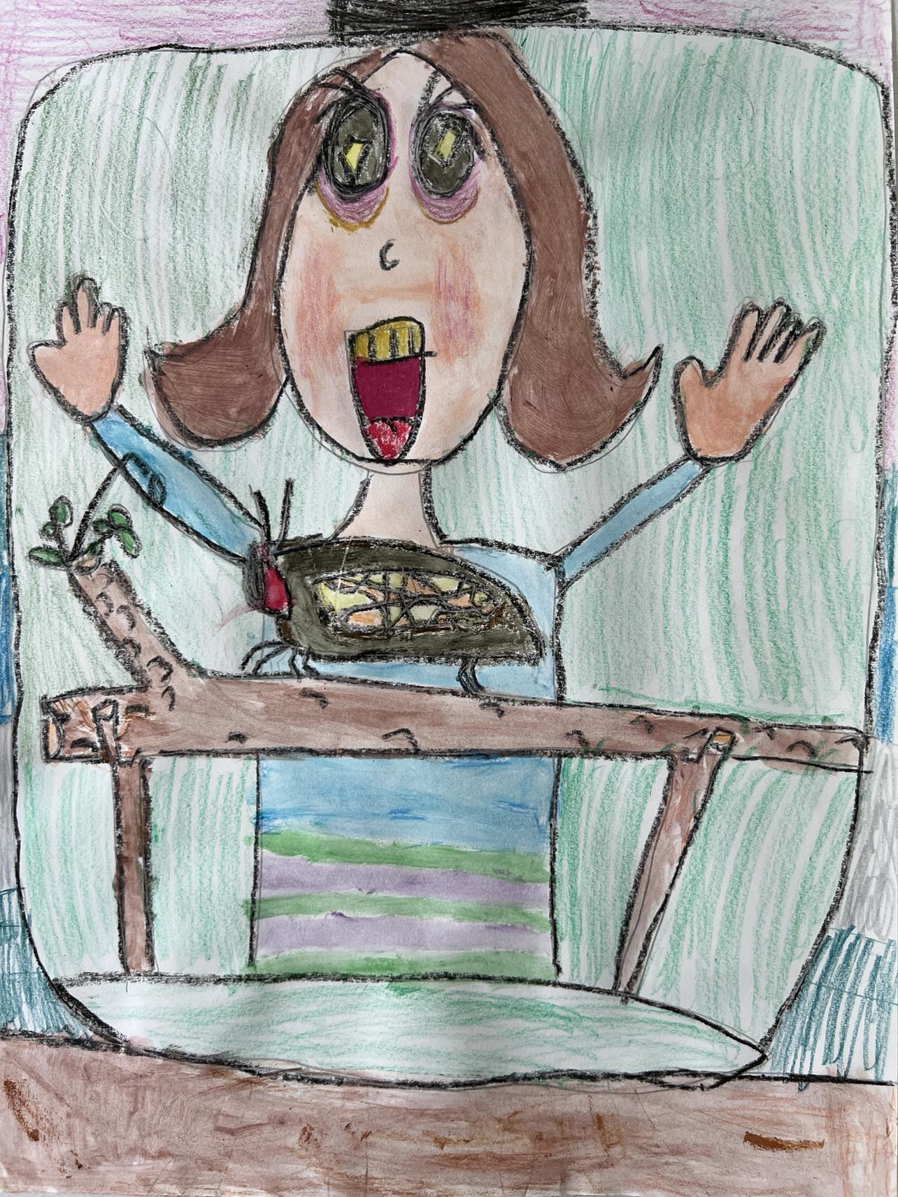 In this painting, Fiona was looking at the cicada in a glass jar with excitement.
